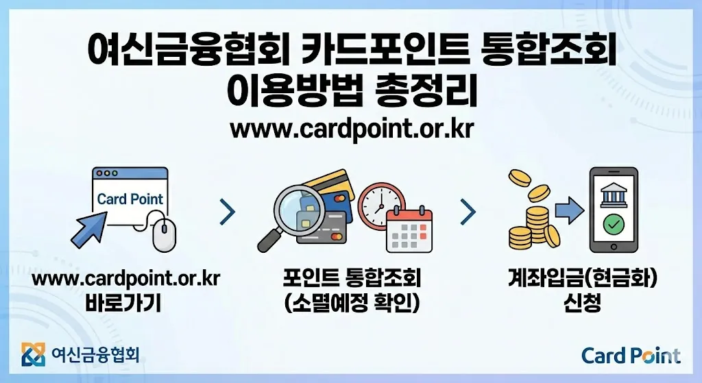 여신금융협회 카드포인트 통합조회 서비스를 알고 계신가요? 매년 약 1,000억원 이상의 카드 포인트가 유효기간 만료로 소멸되고 있습니다. 이 글에서는 여러 카드사에 흩어진 카드 포인트를 한 번에 조회하고, 현금으로 계좌입금 받는 방법, 소멸예정 포인트 확인 방법, 기부 방법까지 상세히 정리했습니다.